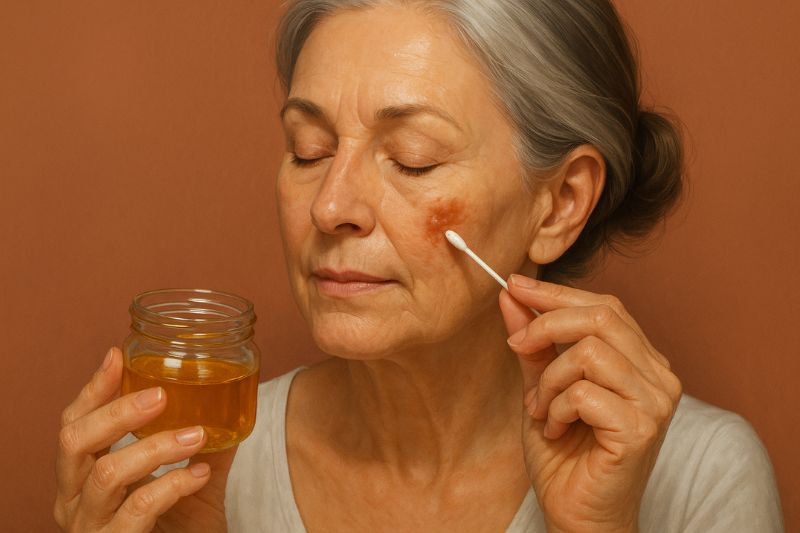 - לחילופין, ערבבו 2 כפות של חומץ תפוחים, עם חצי כוס מים ו-2 כפות דבש. השתמשו בצמר גפן ומרחו על העור. השאירו למשך 10 עד 15 דקות, ושטפו במים. בצעו פעם ביום.
