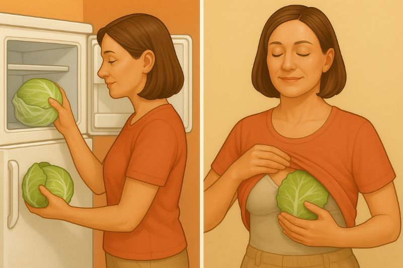 - מניחים את עלי הכרוב הנקיים והקרים על החזה (אפשר לשים גוזיה משוחררת כדי שיחזיק אותם, או שאתם יכולים לשכב על הגב ולחכות)